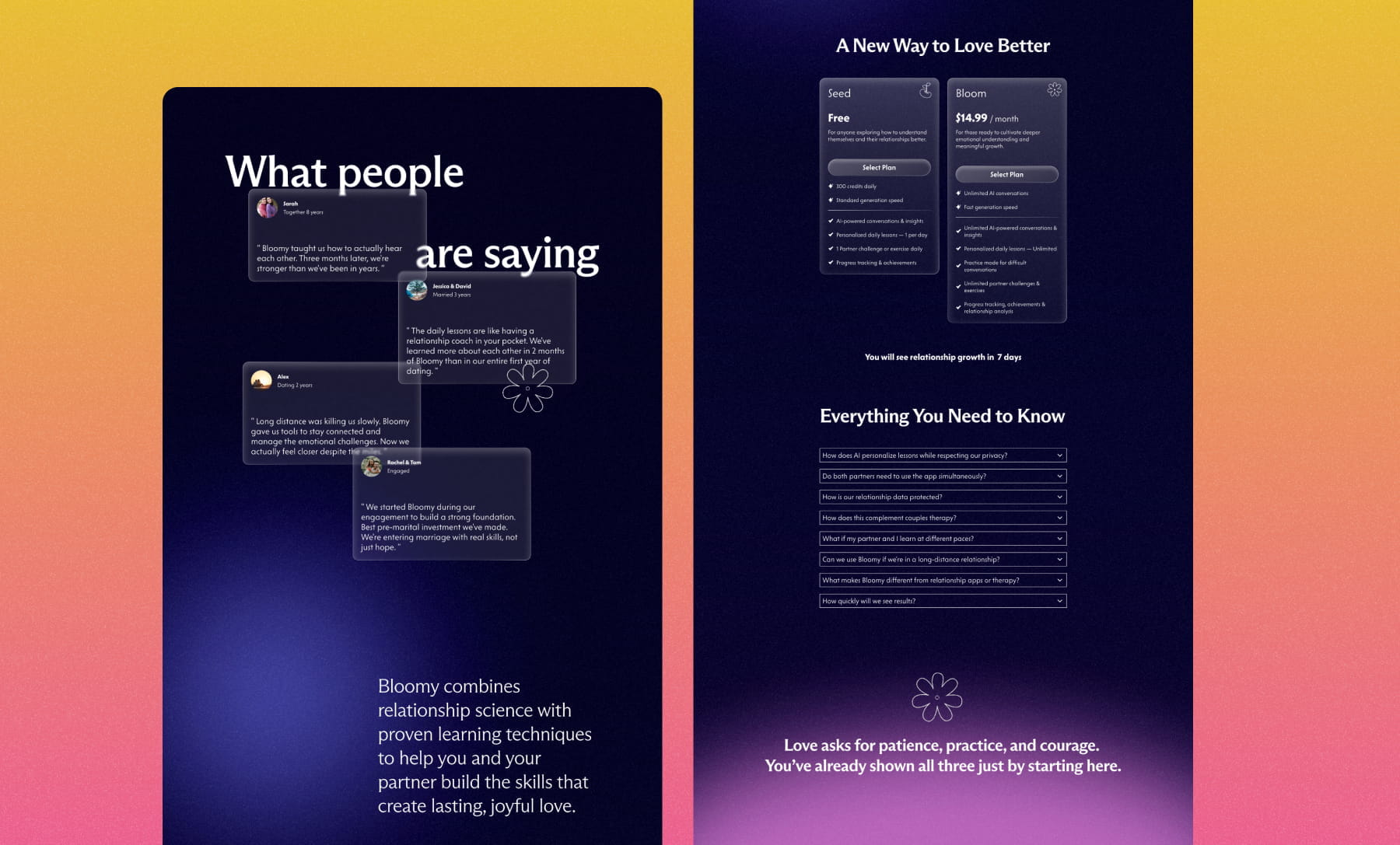Bloomy is an AI relationship tool designed to help couples grow through conflict with understanding and care. In this project, I designed the landing page to introduce the product’s purpose and core features through a clear, emotionally driven experience.The goal was to communicate Bloomy’s emotional value quickly by guiding users to explore themselves first and then their relationship, step by step. The design emphasizes trust, curiosity, and emotional safety, while naturally leading users toward trying the product.